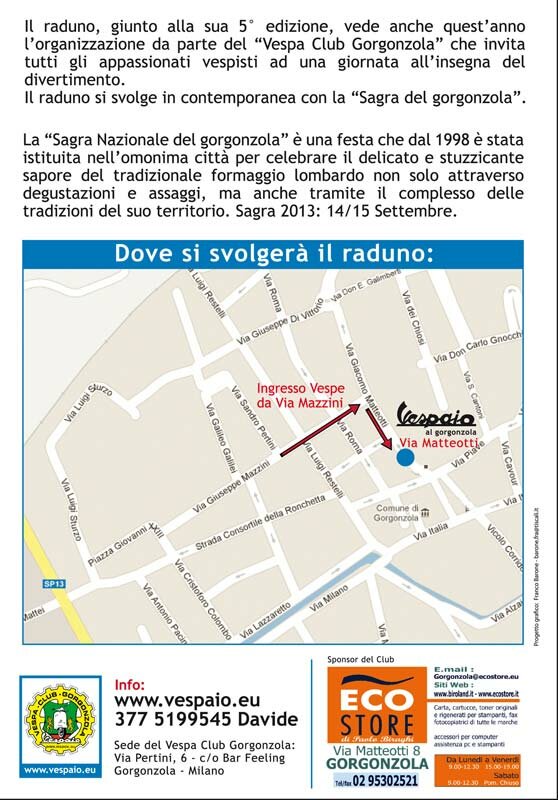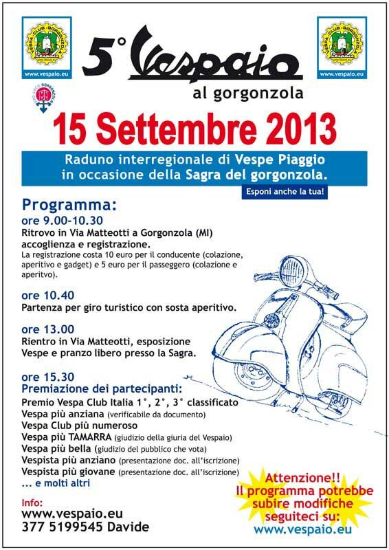 La domenica 15 settembre 2013 si terrà a Gorgonzola, in occasione della sagra omonima, il 5° raduno chiamato “Vespaio al gorgonzola”, organizzato da Vespa club Gorgonzola che , anche se esistente da pochi anni, si è già affermato sul territorio ricevendo elogi dal direttivo del vespa club Italia al quale appartiene.
